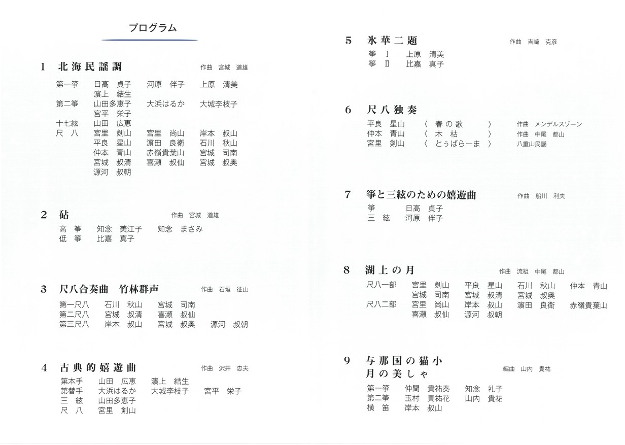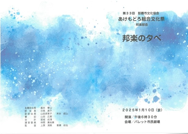 邦楽部会は、日本箏(箏、十七絃)、三絃、そして尺八の会員で構成されています。主な活動は、「あけもどろ総合文化祭」における「邦楽のタベ」演奏会です。その他、会員独自のコンサート、琉球楽器とのコラボレーションコンサー ト、小中高生に対するアウトリーチなどの活動も行っています。 四百年前の古曲から現代曲まで幅広く演奏します。沖縄での活動人口はまだまだ少ないのですが、より多くの活動機会をつくり、宮城道雄作曲「春の海」に代表される日本音楽の箏と尺八の優美な音色を広められるように心がけています。