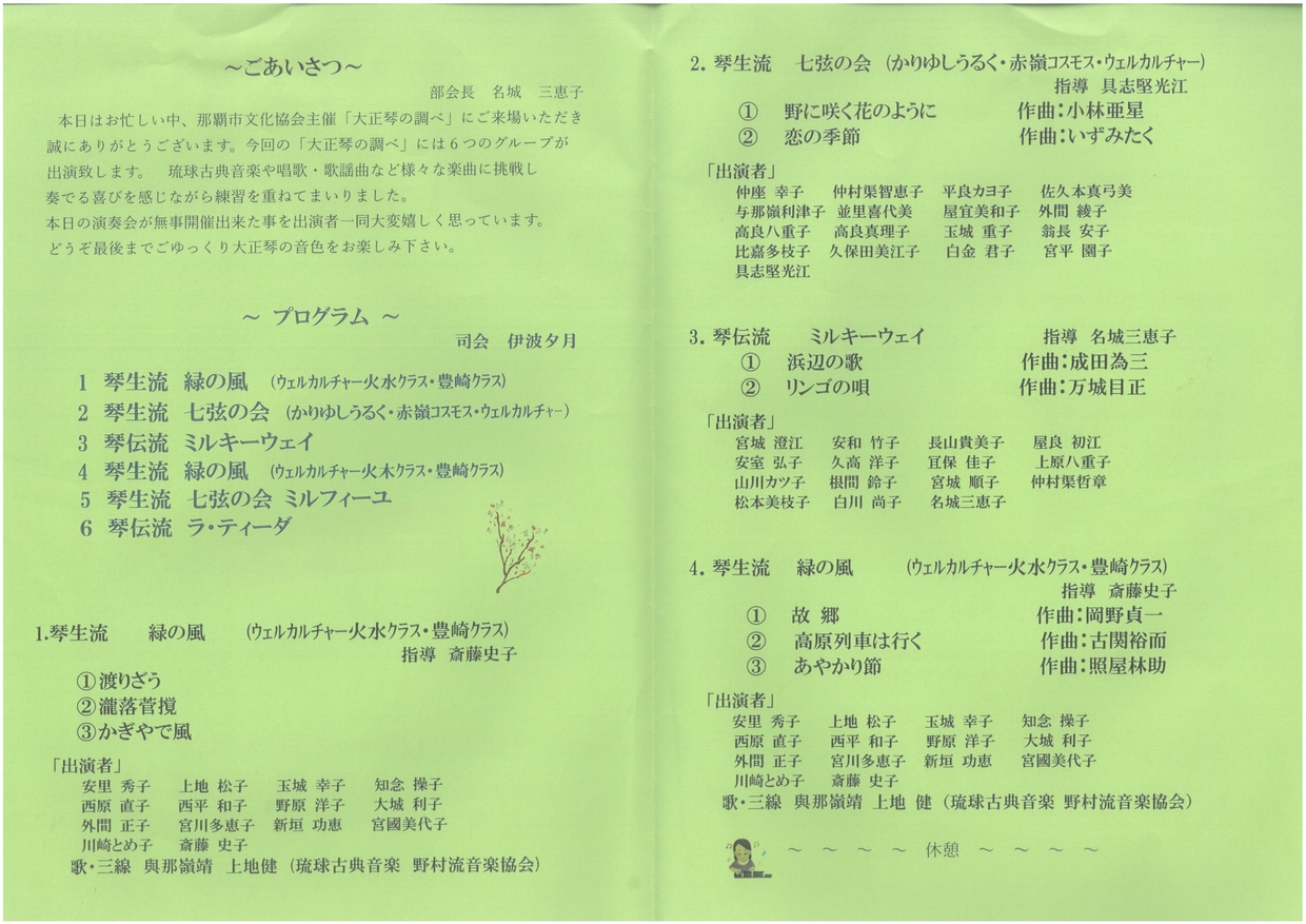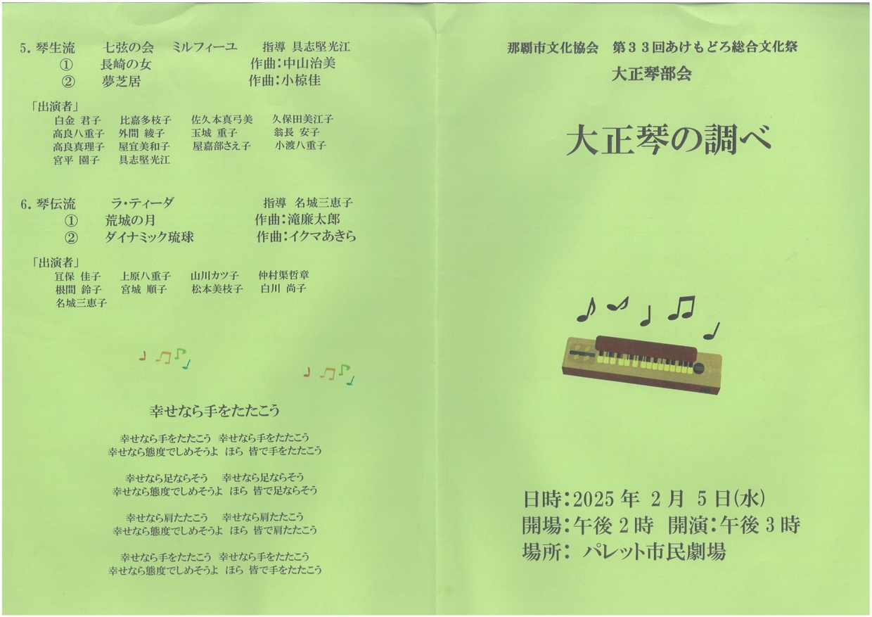 大正琴部会は平成10年に創立され、今年で25年になります。現在は、琴生流と琴伝流の2流派82名の会員が、年に一度のあけもどろ総合文化祭に向け活動しています。大正琴は持ち運びが手軽で、楽譜も数字譜なので音楽経験のない方でも学びやすい楽器です。今では子供たちのサークルも増え、幅広いジャンルの曲が演奏されています。大正琴を一緒に楽しむことで掛け替えのない仲間もでき、 発表会やボランティア活動等を通して生き甲斐にもなります。