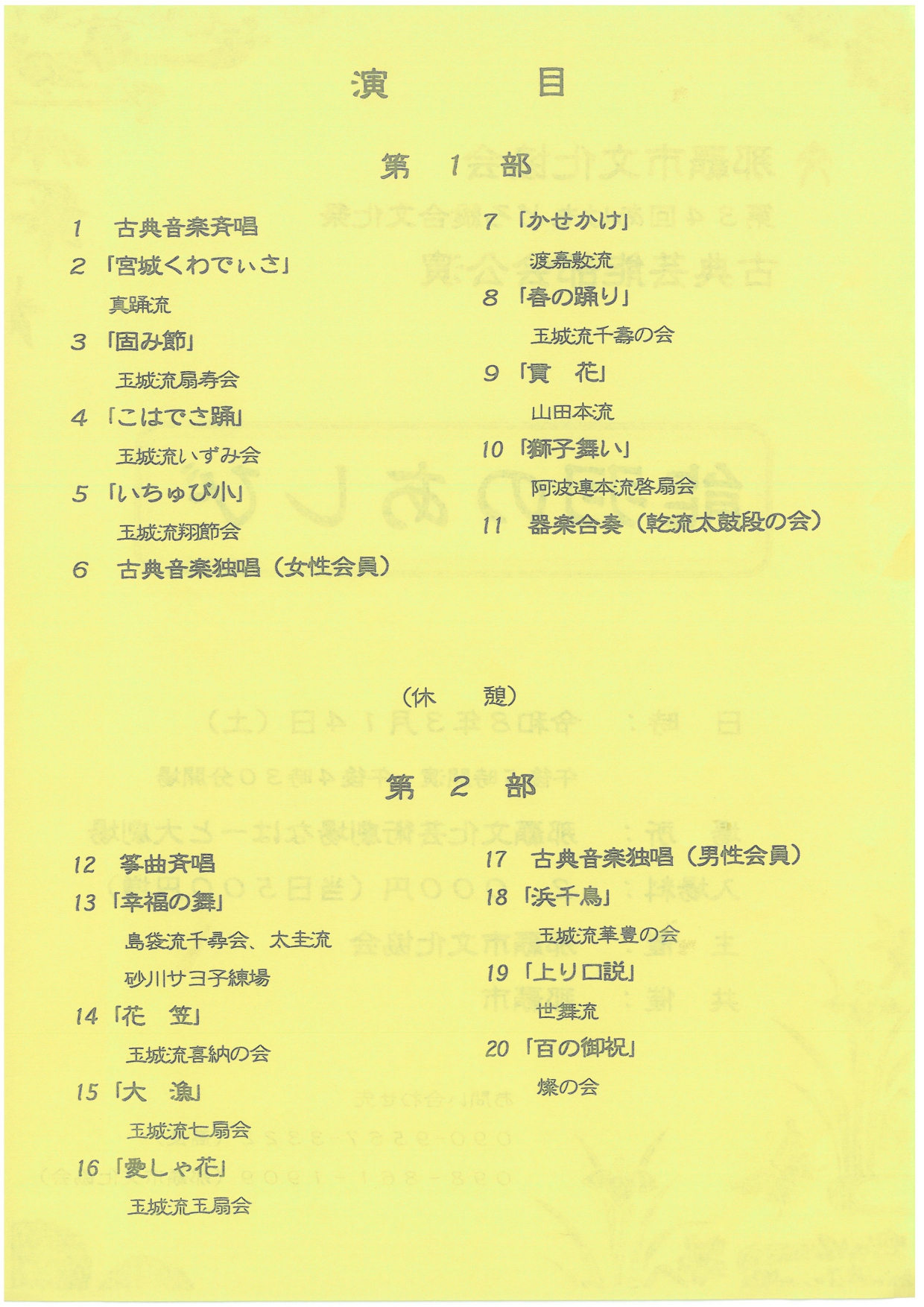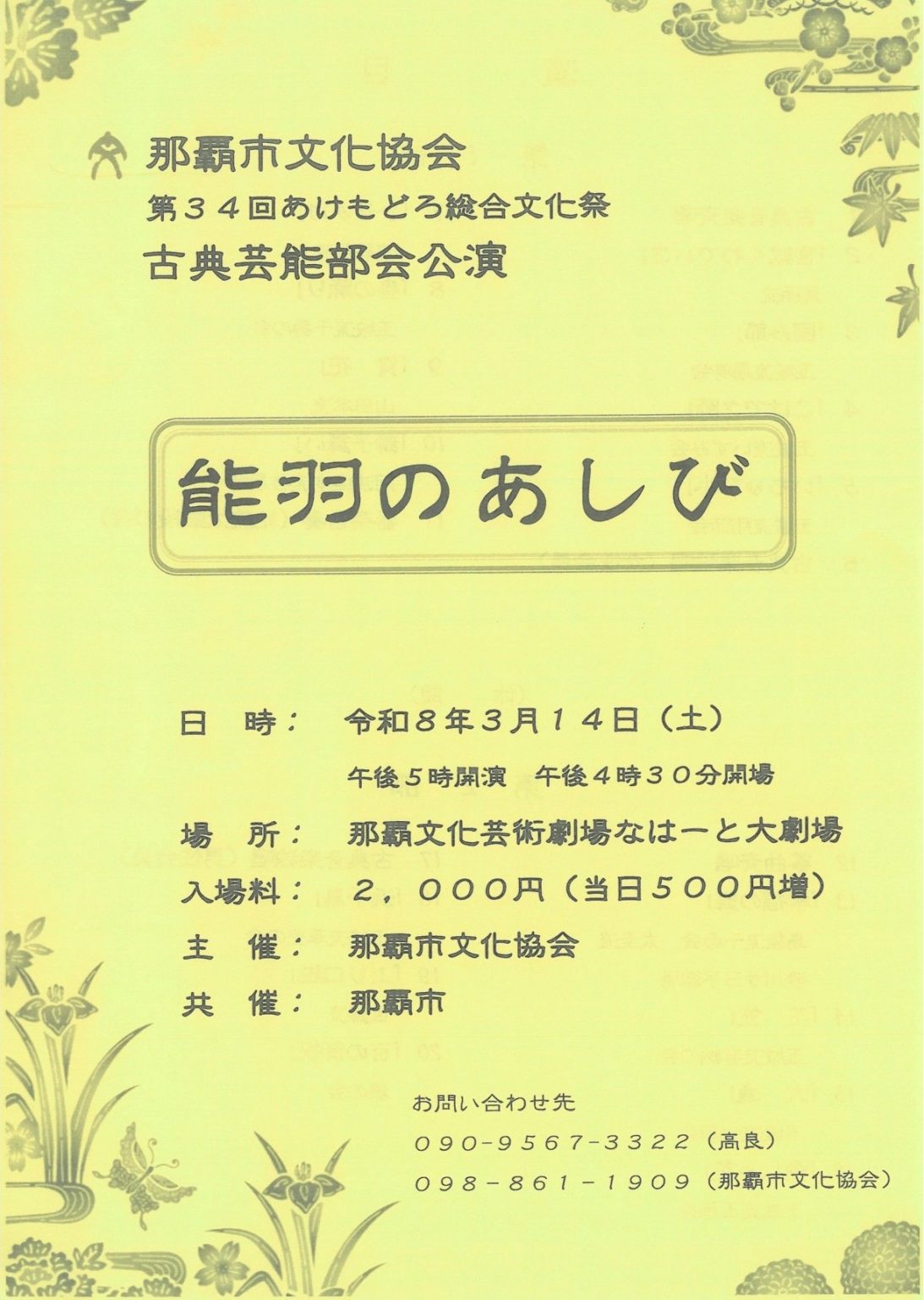 2026/3/14(土)開催「能羽のあしび」 2025.12.25あけもどろ総合文化祭 第34回 那覇市文化協会 あけもどろ総合文化祭 古典芸能部会公演 能羽のあしび ◆日時:2026(令和8)年3月14日(土) ◆開場:16:30 ◆開演:17:00 ◆会場:那覇市文化芸術劇場なはーと大劇場 ◆料金:2,000円(当日500円増) ◆主催:那覇市文化協会 (共催:那覇市) ▼詳細は下記をご確認ください。